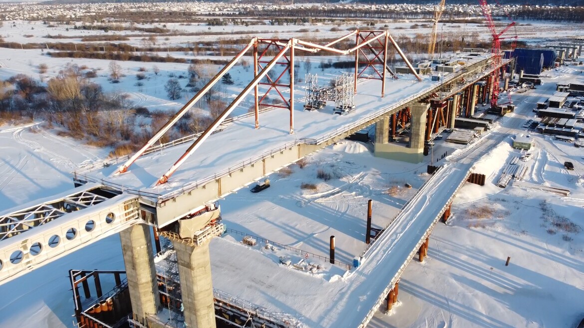 Рабочие продолжают возводить мост через Каму протяженностью 1,3 км. Техническая готовность объекта равна 47%.