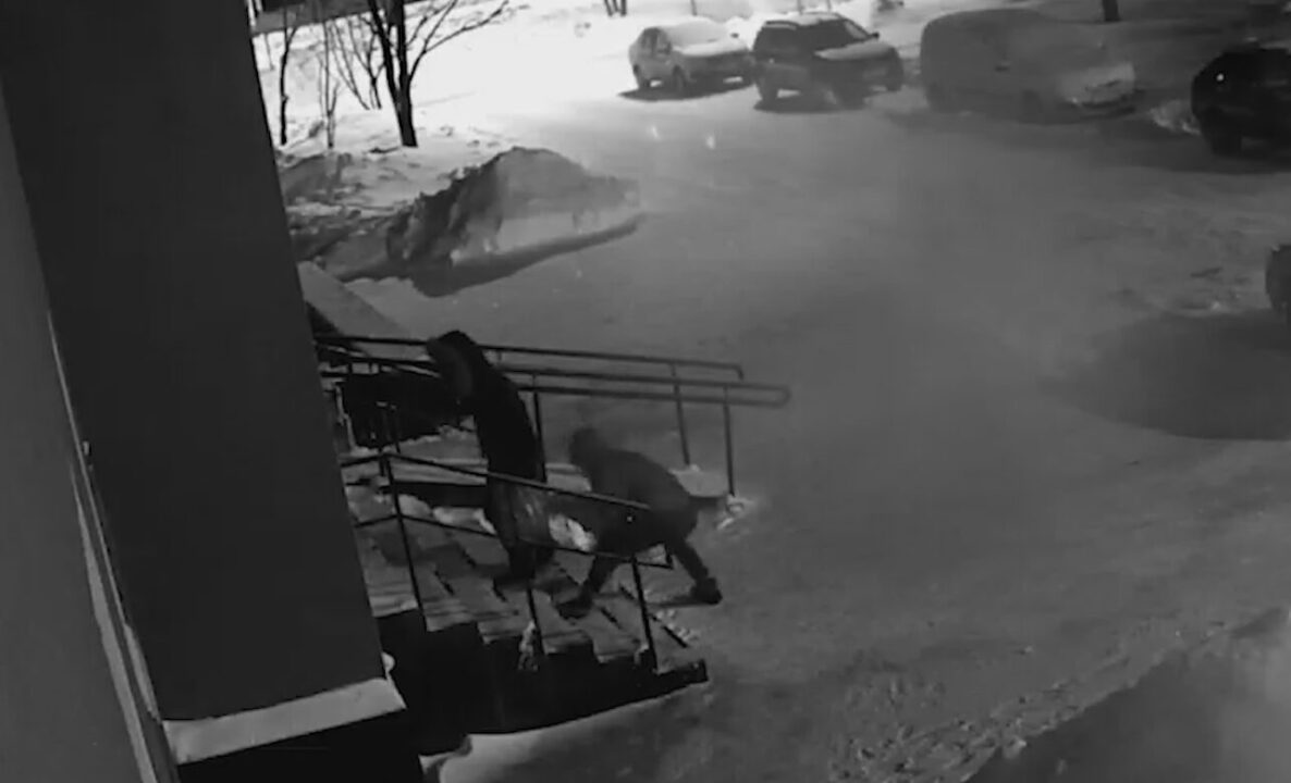 На представленных МВД кадрах видно, как подозреваемый заприметил жертву, оглянулся по сторонам, убедившись, что никого поблизости нет. Он нагнал женщину у входа в подъезд, вырвал сумку и убежал.