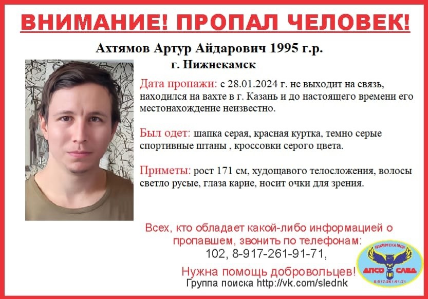 В Казани пропал находившийся на вахте 29-летний житель Нижнекамска Артур Ахтямов. Он перестал выходить на связь с родными с 28 января. Об этом сообщают волонтеры добровольного поисково-спасательного отряда «След».