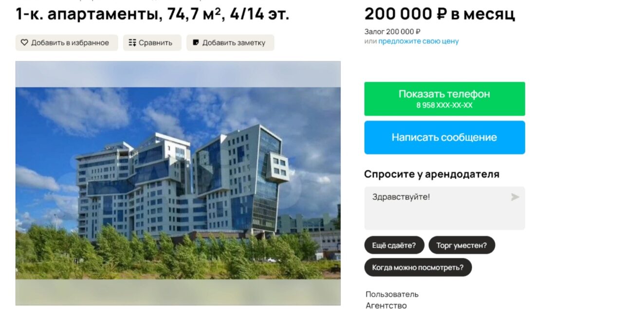 Круглую сумму 170 тысяч рублей придется выложить за аренду однокомнатной квартиры в Кировском районе. Арендодатель объясняет высокую стоимость панорамными видами на реку и город с 14-го этажа и роскошным ремонтом. Квартира находится в одной из трех башен ЖК «Атлантис Делюкс». Жильцам придется внести залог в размере 340 тысяч рублей.