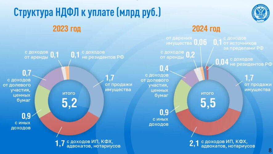 По словам Марата Сафиуллина, основной прирост обеспечили индивидуальные предприниматели, главы крестьянско-фермерских хозяйств, адвокаты и нотариусы. Таковых в числе декларантов 2025 года было 5,1 тыс. Сумма исчисленного ими налога к уплате достигла 2 млрд рублей — на 400 млн (24%) больше, чем в 2024 году (1,7 млрд рублей).