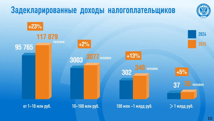 Так, почти вдвое — с 29 до 55 тыс. — выросло количество граждан, подавших в упрощенном порядке заявления на налоговые вычеты. Почти на четверть выросло и число тех, кому пришлось уплачивать налоги в бюджет. Количество декларантов увеличилось с 47 до 58 тысяч (плюс 23%), хотя общая сумма налогов по представленным декларациям выросла на величину погрешности: в 2025 году она составила 5,5 млрд рублей, что на 300 миллионов (6%) больше, чем в 2024-м.