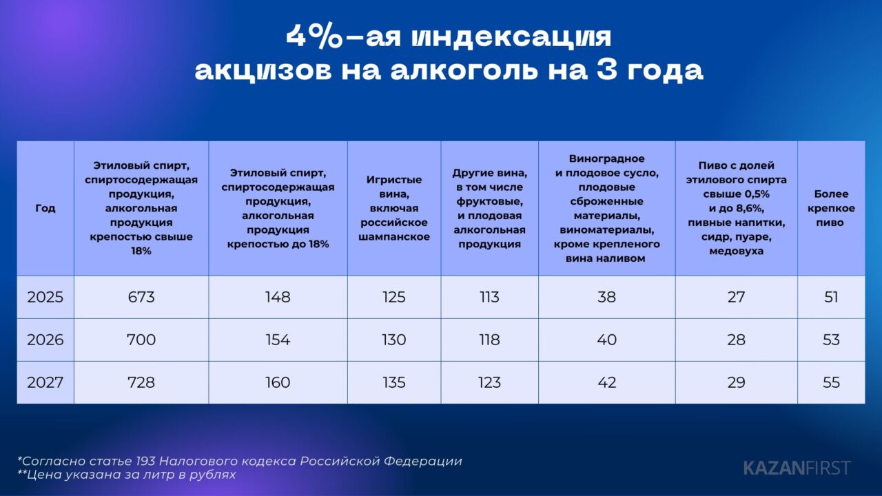 В течение следующих трех лет спиртное в России должно подорожать как минимум на 12%, утверждает законодатель. Интересно, что если в 2023 году ставка на алкогольную продукцию с объемной долей этилового спирта свыше 9% составляла 613 рублей за литр, то в 2027-м государство планирует взимать уже 728 рублей, а это все 18%. Понятно, что инфляция, так или иначе, съедает величину налога. Чтобы он продолжал выполнять свою фискальную функцию, его приходится регулярно индексировать. Однако инфляция действует не только на налог, но и на саму продукцию. По данным Минфина Татарстана, в прошлом году поступления от акцизов в бюджет республики составили в совокупности 17,3 млрд рублей. Рост на 12% принесет казне чуть больше двух миллиардов рублей. Напомним, в общей сложности казна Татарстана заработала в 2023 году более 600 млрд.