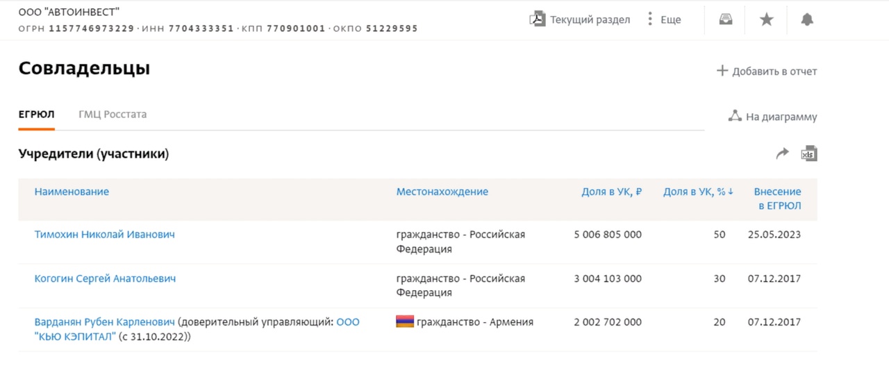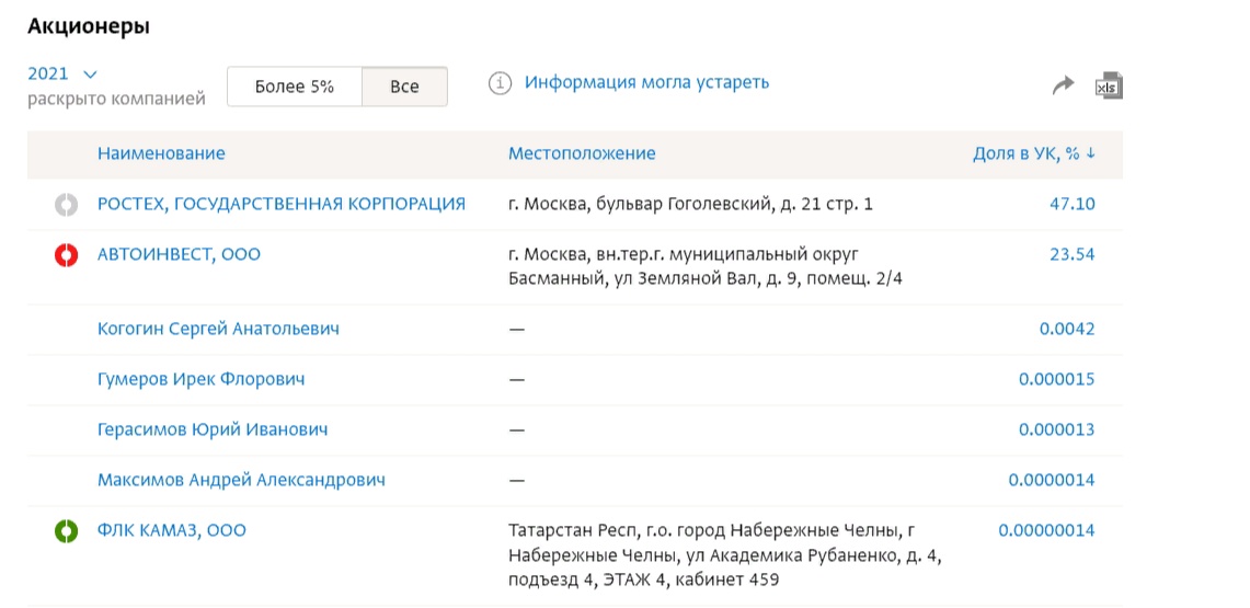 По последним данным, 47,7% принадлежит «Ростехнологиям», 23,54% компании «Автоинвест». Совладельцы «Автоинвеста»: член совета директоров Ступинской металлургической компании, экс-владелец Ступинской титановой компании Николай Тимохин – 50%, Сергей Когогин – 30%, Рубен Варданян – 20%. Самые крупные владельцы-физлица представлены на картинке ниже, доля татарстанской ФЛК «КАМАЗ» снижается до несущественных процентов.
