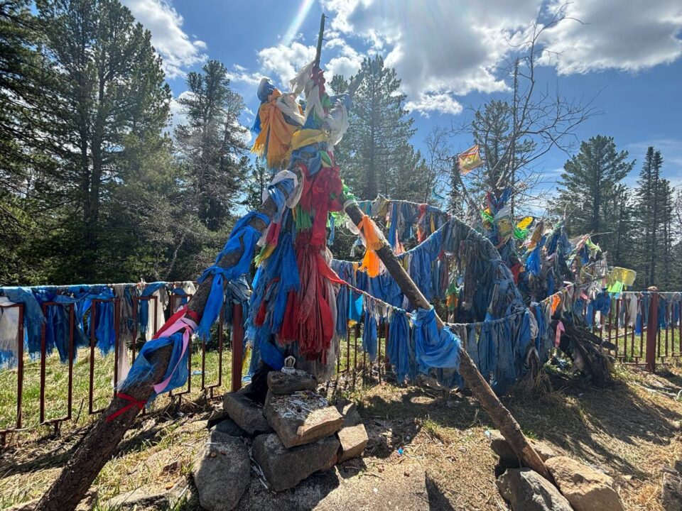 От дацана до Байкала путь лежал неблизкий — около 240 километров. Часть дороги проходила через тайгу, в это время года усыпанную яркими сиреневыми цветами багульника. В середине пути — внезапная остановка. На наш немой вопрос, в чем же причина, гид Дарина с хитрой улыбкой отвечает: «Пора бурханить». Но тут же сбивает наш пыл — «бурханить» означает давать жертвоприношение духам. Путешественники, которые держат путь к батюшке-Байкалу, должны остановиться у специальных беседок или возле столбов сэргэ, на которых повязаны цветные ленты. Здесь и проходит обряд задабривания.