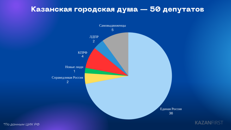 По своему списку «Единая Россия» вновь проводит 18 человек. Еще 18 представителей партии победили в одномандатных округах — везде, где выдвигались. Таким образом, единороссы будут контролировать 36 из 50 мест в Казгордуме. KazanFirst подробно писал о кандидатах «Единой России».