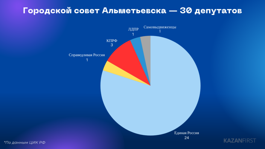 В Альметьевске у «Единой России» самый высокий результат — 73% (список возглавлял боец СВО Артем Ванюков). КПРФ набрала 19,8%, а ЛДПР — 6,8%. Другие партии в выборах не участвовали. Таким образом, от коммунистов в городском совете будут три депутата, от ЛДПР — один. У «Единой России» с учетом победы в одномандатных округах — 24 депутата. Также через округа прошел один представитель «Справедливой России» и один самовыдвиженец. Всего в горсовете Альметьевска 30 мест.