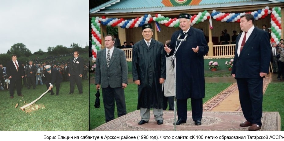 В 1996 году тогдашний президент России Борис Ельцин посетил Сабантуй в Арском районе, став главным героем праздника. И это был спланированный сценарий. В тот период шла избирательная кампания по выборам президента России. Главным оппонентом Ельцина был более молодой лидер КПРФ Геннадий Зюганов, пользовавшийся в те годы огромным доверием левого протестного электората, а потому считавшийся опасным конкурентом. Поэтому Кремлю нужно было показать россиянам, что Ельцин еще физически силен, а значит, способен и далее управлять государством. Для демонстрации физических кондиций Бориса Николаевича было выбрано популярное состязание – разбивание палкой глиняного горшка с завязанными глазами. Но чтобы гарантировать успешный результат, прибегли к хитрости – Ельцину повязали глаза прозрачной повязкой, сквозь которую горшок хорошо просматривался. Так что ему не составило труда разбить его. Что и произошло под бурные крики одобрения и аплодисменты.