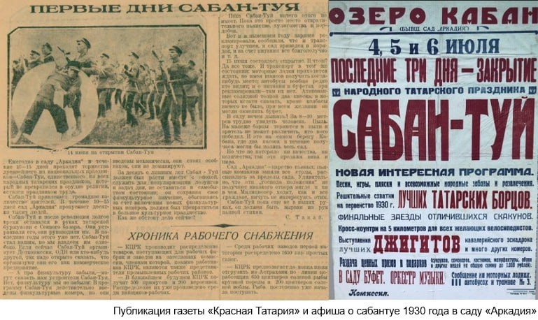 Впрочем, празднование Сабантуя не ограничивалось только 25 июня. В Казани на протяжении 1920-х годов этот праздник длился в течение 10-15 дней. В 1930 году, когда отмечалось 10-летие образования ТАССР, сабантуй стартовал 15 июня, а его закрытие шло в течение трех дней – 4, 5 и 6 июля. В эти годы Сабантуй чаще всего проводили в ныне не существующем саду «Аркадия», располагавшемся на южном берегу озера Средний Кабан, около так называемого Чертова угла. Тогда эта местность считалась загородной. Программа празднования была разнообразной, включала в себя как традиционные татарские народные игры, так и военно-спортивные дисциплины, имевшие не только соревновательный, но и демонстрационный характер, — велосипедные и лодочные гонки, «морские бои» на озере Средний Кабан, борьба-куреш, конные скачки, джигитовка и др. Отдельно проводились состязания среди детей («детский Сабантуй»). Так что неформально сабантуй в «Аркадии» называли народной олимпиадой, победителям которой вручали разнообразные призы, имевшие бытовую ценность.