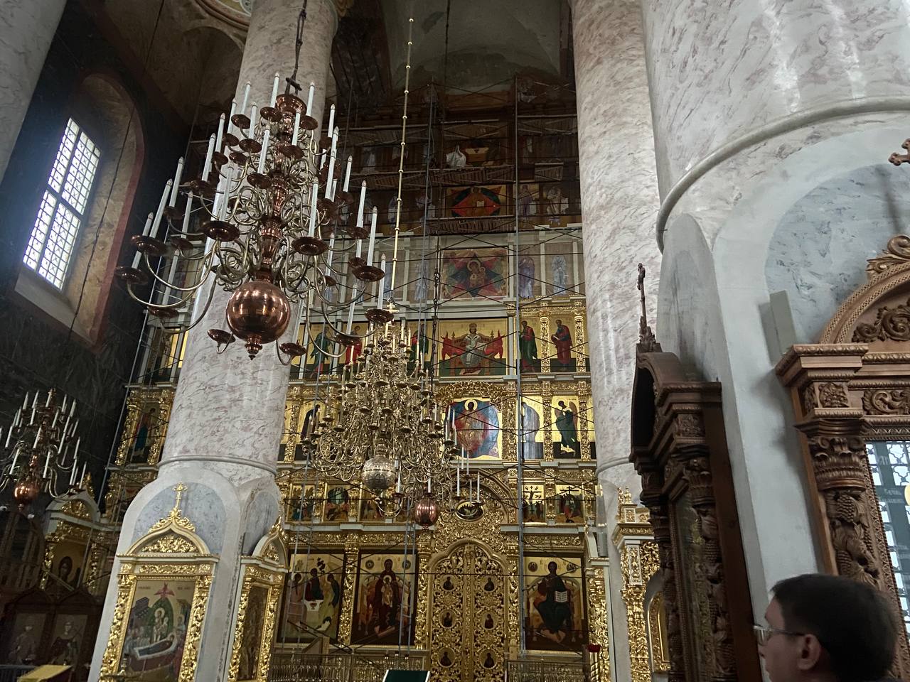 Нам же повезло заглянуть в самое сердце Кремля — на Пречистенскую колокольню, взметнувшуюся на 80 метров в небо. Нашим проводником стал дьякон Максим, который рассказал историю колокольни, две предыдущие версии которой разобрали из-за проблем с фундаментом.