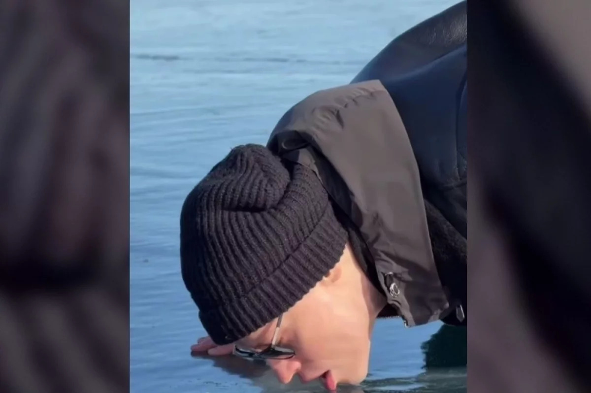 На кадрах видео певец Ярослав Дронов, одетый в черные куртку, штаны и шапку, в солнцезащитных очках, лижет лед озера Байкал.