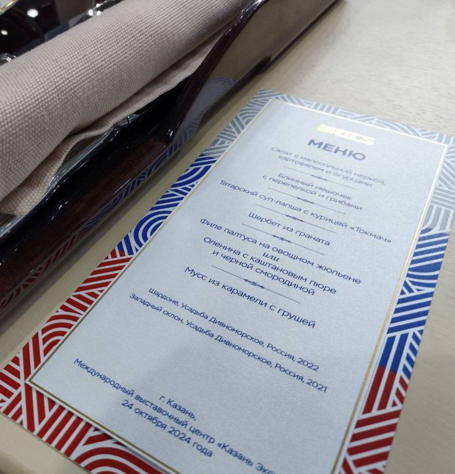 Среди прочих, на рабочем завтраке для участников саммита подавали токмач — это традиционное блюдо татарской кухни, которое объединяет в себе и первое (суп), и второе (картофель с курицей). Также гостям предлагали такие блюда, как блинный мешочек с перепёлкой и грибами, шербет из граната, филе палтуса на овощном жюльене, оленина с каштановым пюре и чёрной смородиной, а также мусс из карамели с грушей.