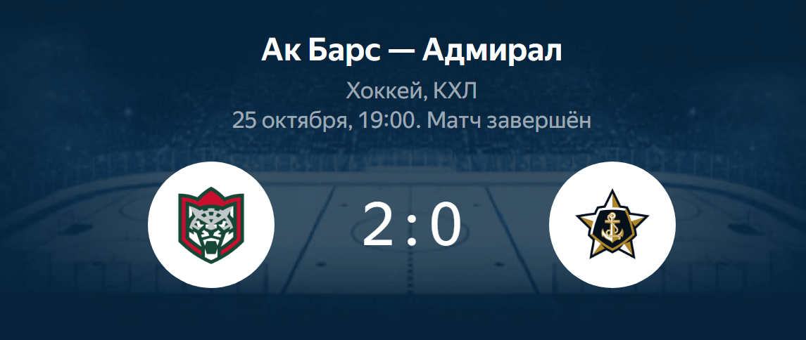 В Казани завершился матч регулярного чемпионата КХЛ между местным «Ак Барсом» и владивостокским «Адмиралом». Хозяева одержали победу со счётом 2:0, сообщает «Бизнес Online».
