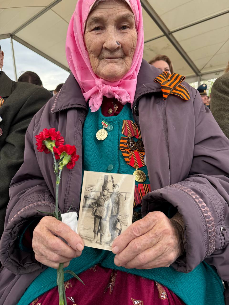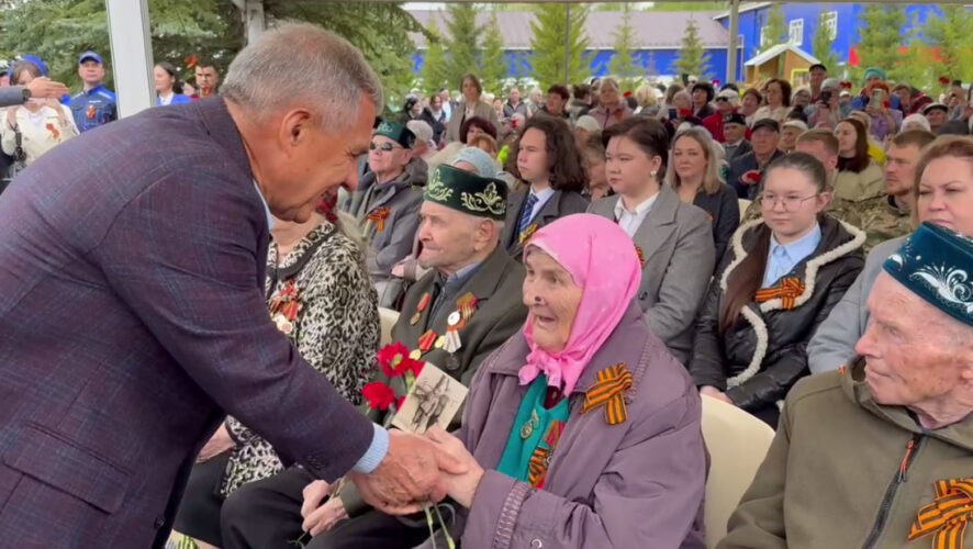 Перед началом торжественного мероприятия Минниханов первым делом подошел поприветствовать ветеранов, которые приглашены в качестве почетных гостей. Одна из участниц — Мадина Нуруллина — принесла с собой сохранившуюся фотографию военных лет.