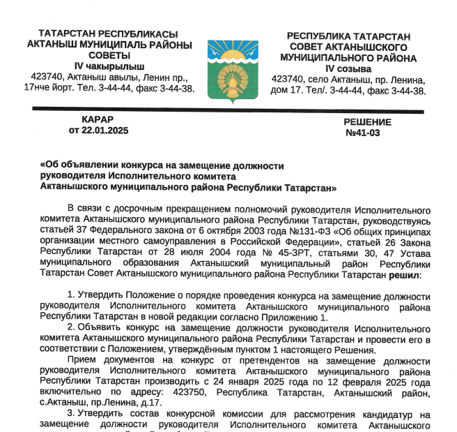 В Актанышском районе Татарстана объявлен открытый конкурс на должность руководителя Исполнительного комитета. Это стало необходимым после досрочного окончания полномочий предыдущего главы. Соответствующее решение опубликовано на официальном портале правовой информации РТ.