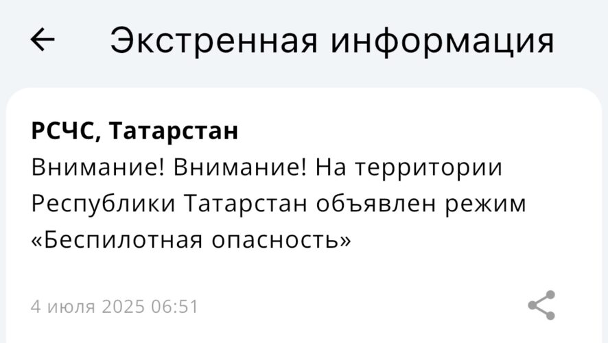 Утро пятницы, 4 июля, для жителей Татарстана началось с тревожных сообщений от МЧС. В республике вновь объявлен режим беспилотной опасности.