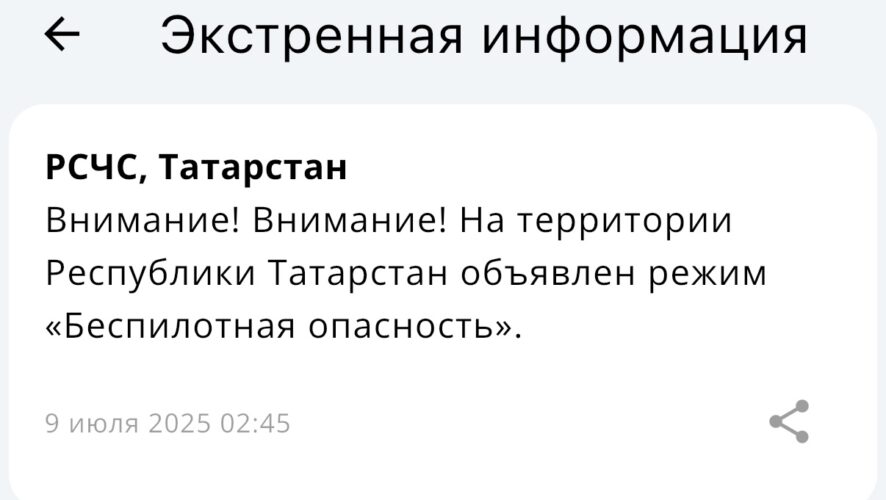 Сегодня в 02:45 от МЧС России жителям и гостям Республики Татарстана пришло предупреждении о возможной атаки БПЛА.