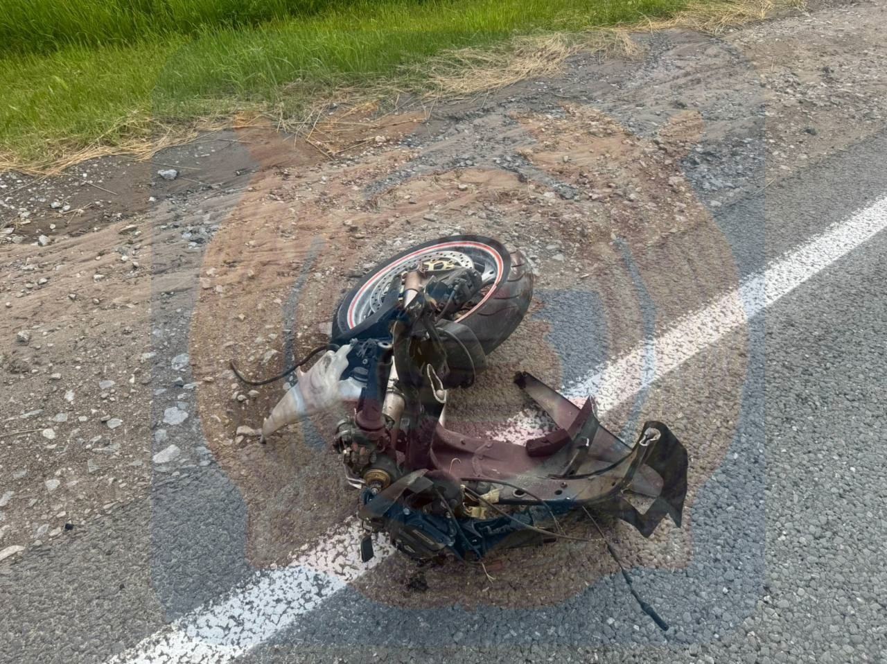 По предварительным данным, водитель автомобиля «Лада» столкнулся с мотоциклом Honda. Известно, что последний двигался в попутном направлении. Судя по снимкам, байк от удара разорвало пополам.