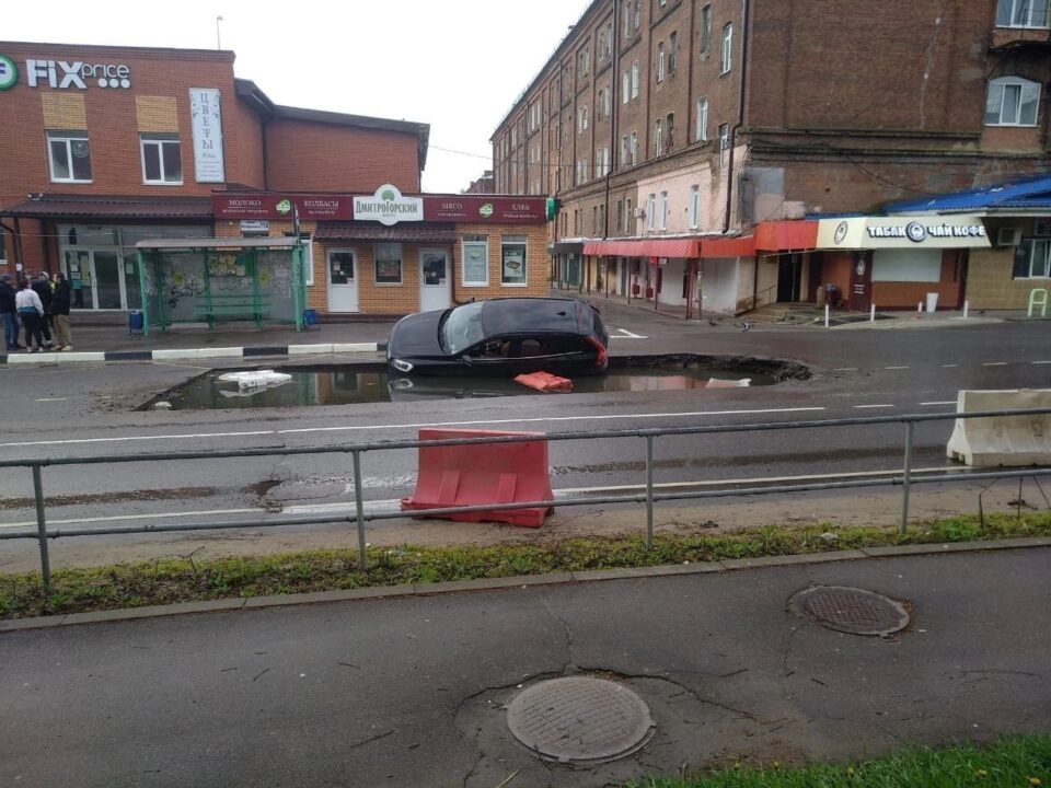Необычная авария произошла в Подмосковье. Девушка за рулем внедорожника Volvo проигнорировала знаки и перекрытую дорогу, выехала на закрытый участок проезжей части и угодила в огромную яму, заполненную водой.