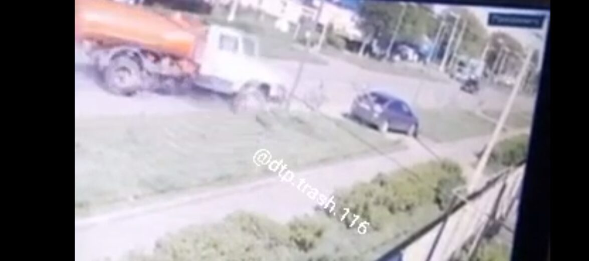 На кадрах видно, как спецтехника влетает в столб, вылетает на обочину, задев стоящую рядом легковушку, и переворачивается.