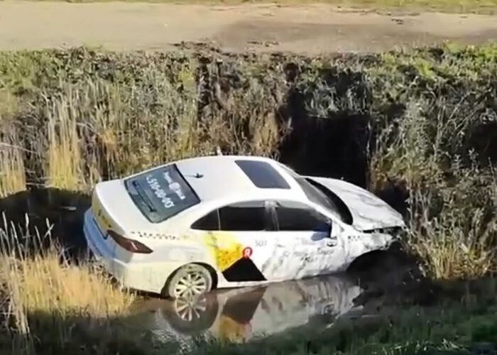 Легковушка такси вылетела с дороги и увязла в канаве на Мамадышском тракте в Казани. Об этом сообщают очевидцы происшествия в соцсетях.