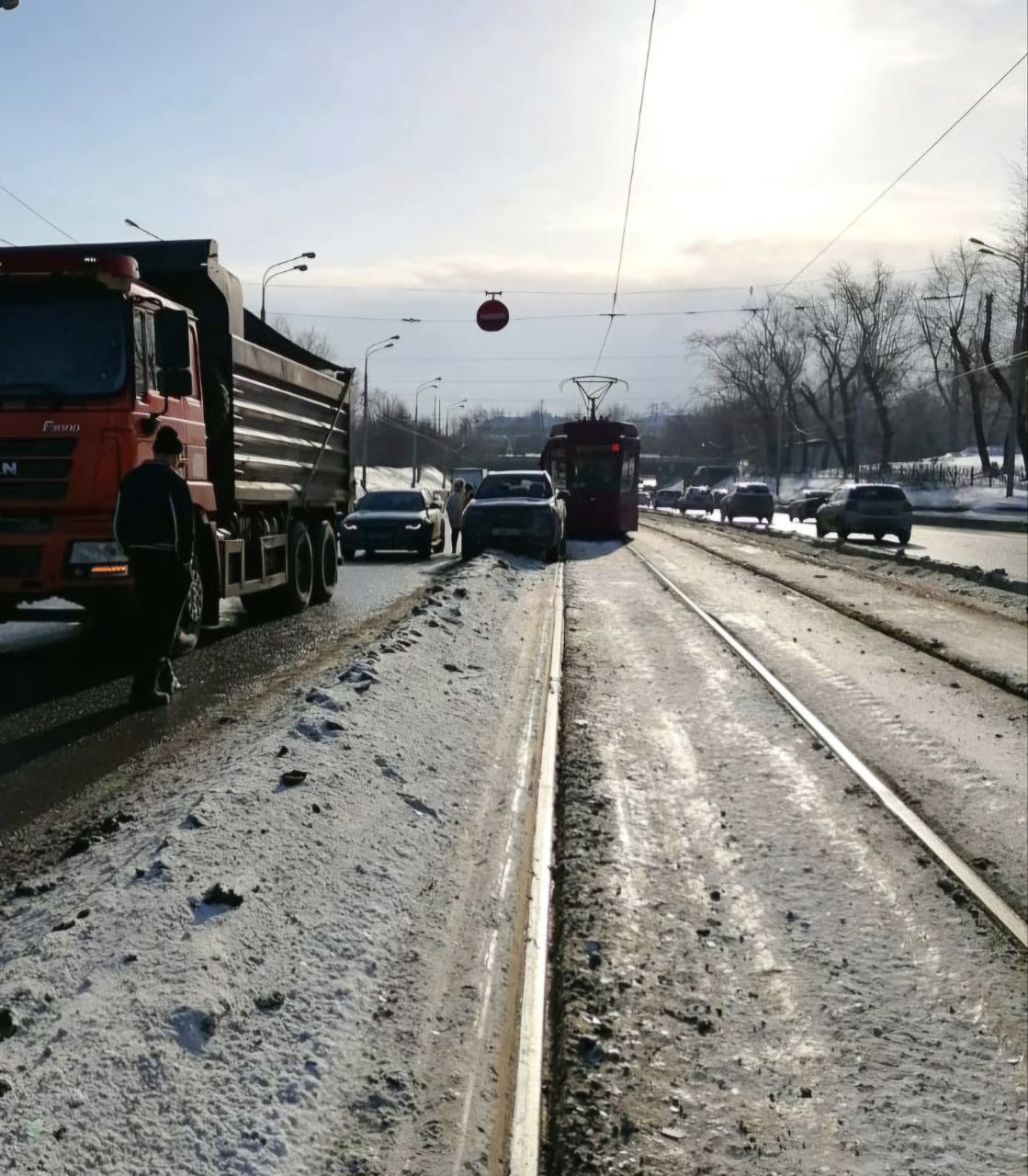 Два автомобиля столкнулись на трамвайных путях по улице Копылова, 1Б в Казани, из-за чего полностью остановилось движение трамваев первого и шестого маршрутов, сообщает «Метроэлектротранс».