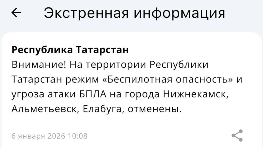 Режим ввели сегодня примерно в 11 часов вечера. Через три часа в Альметьевске, Нижнекамске и Елабуге объявили угрозу атаки БПЛА. Жителей и гостей городов просили принять меры безопасности: спуститься в укрытие и не подходить к окнам.