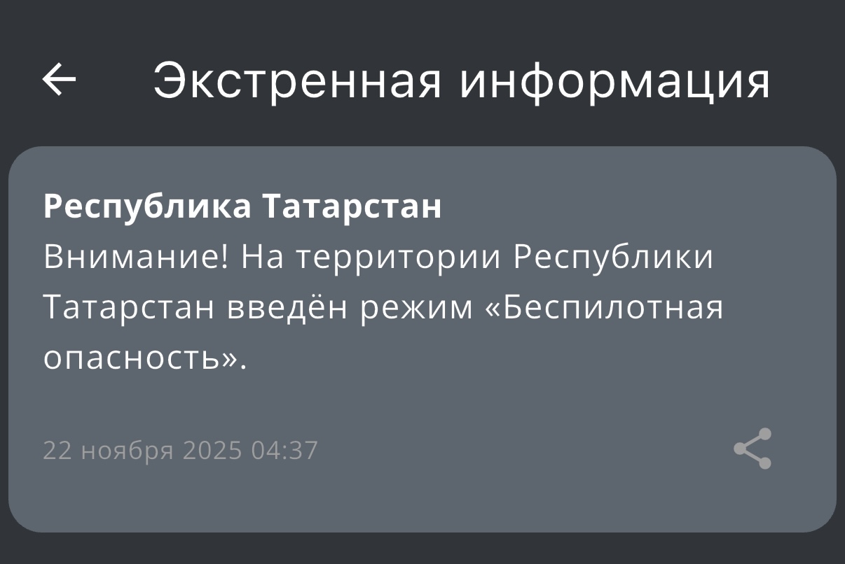 Утро субботы, 22 ноября, для жителей и гостей Республики Татарстан началось с объявленного режима беспилотной опасности. Сообщение от МЧС России поступило в 4:37.
