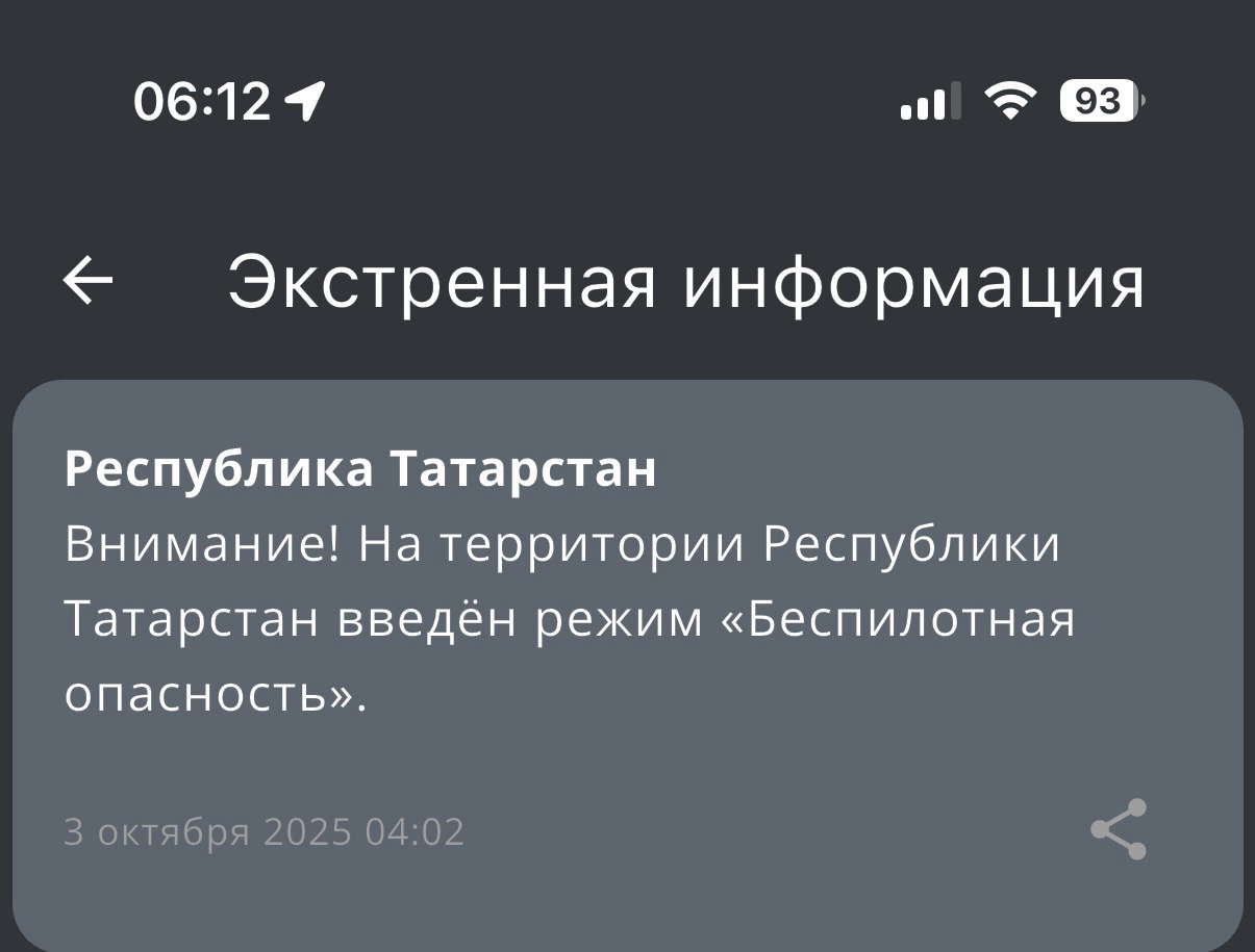 Четвертый раз за неделю в Татарстане вводится режим беспилотной опасности. Сообщение от МЧС России поступило около четырех утра.