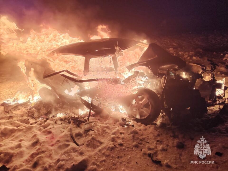 Прибывшие на место пожарные оперативно справились с возгоранием. В легковом автомобиле находились четыре человека — три мужчины и одна женщина. Все они погибли.
