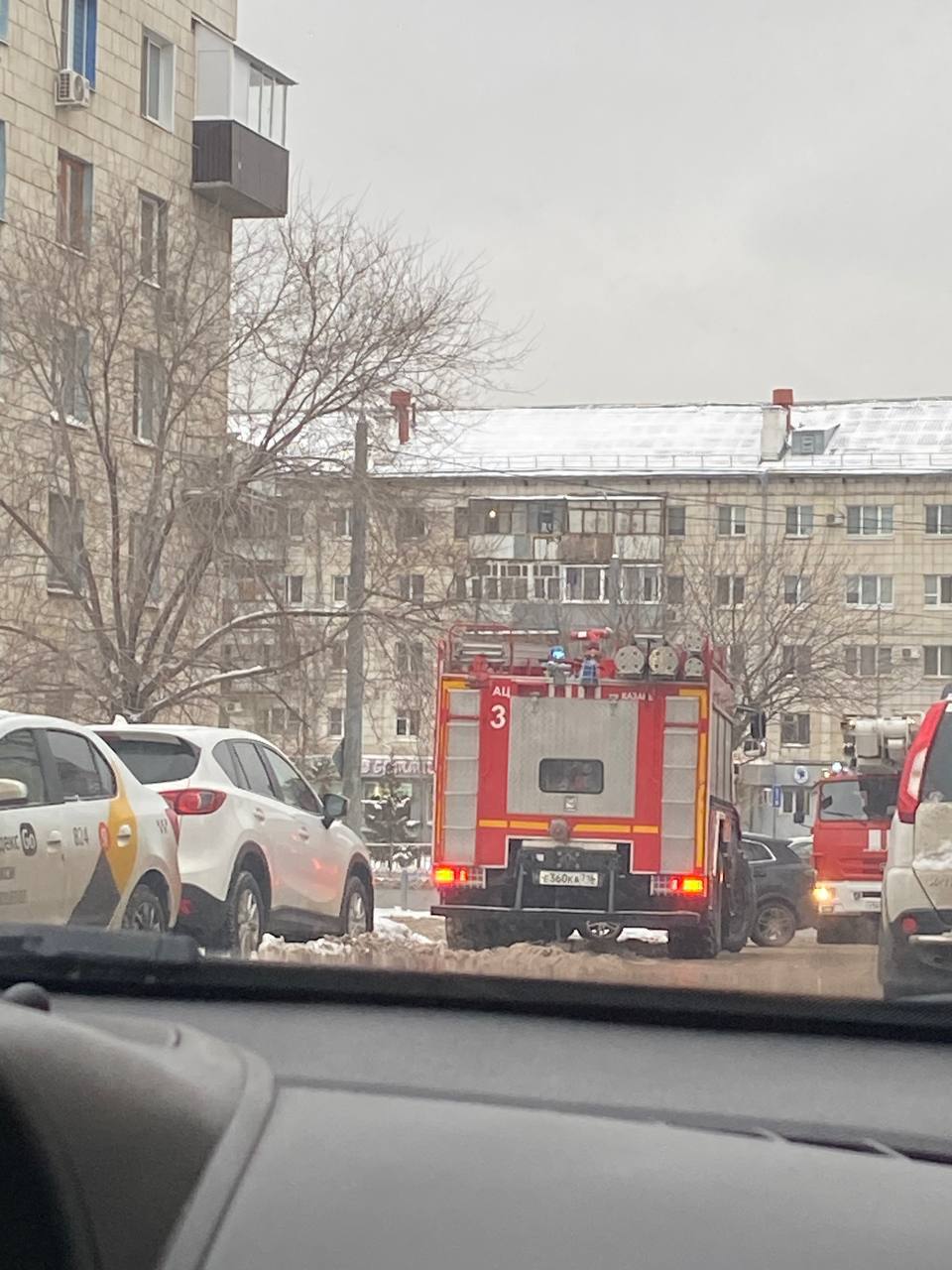 По словам местных жителей, дым идет с крыши, либо с верхних этажей. Автомобилисты засняли пожарных, ехавших на место происшествия.