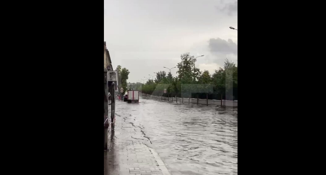 Судя по кадрам, улице Дзержинского пришлось нелегко — проезжая часть полностью ушла под воду. Машины с трудом пытаются проехать, но это едва ли получается сделать.