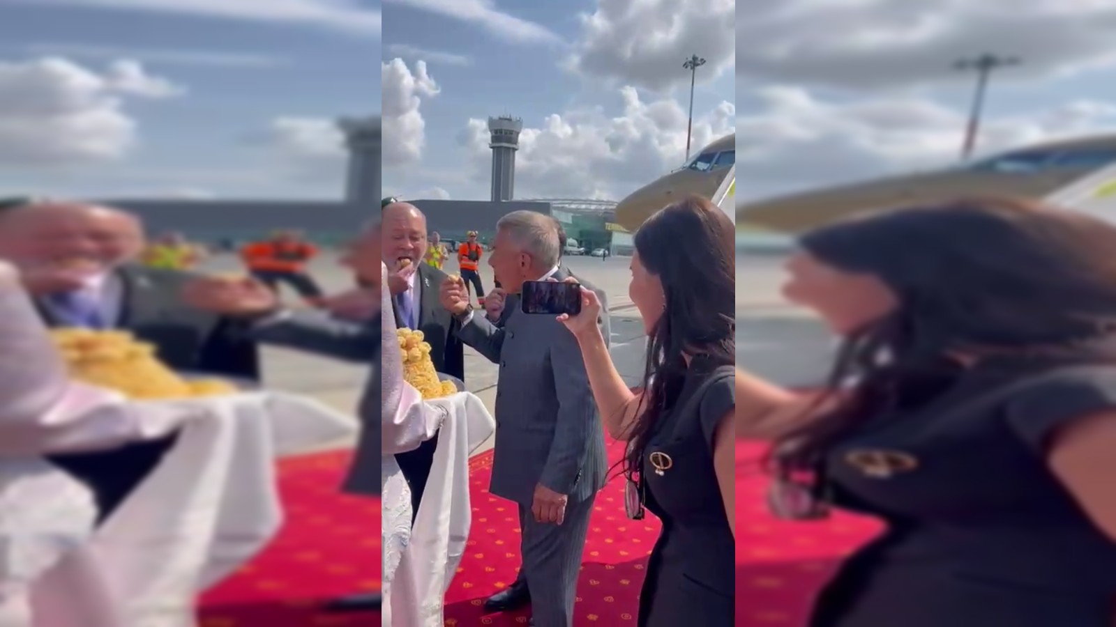 На кадрах видно, как король Малайзии выходит из своего золотого самолёта, его встречает раис Татарстана Рустам Минниханов. Затем они вместе пробуют знаменитое татарское лакомство.