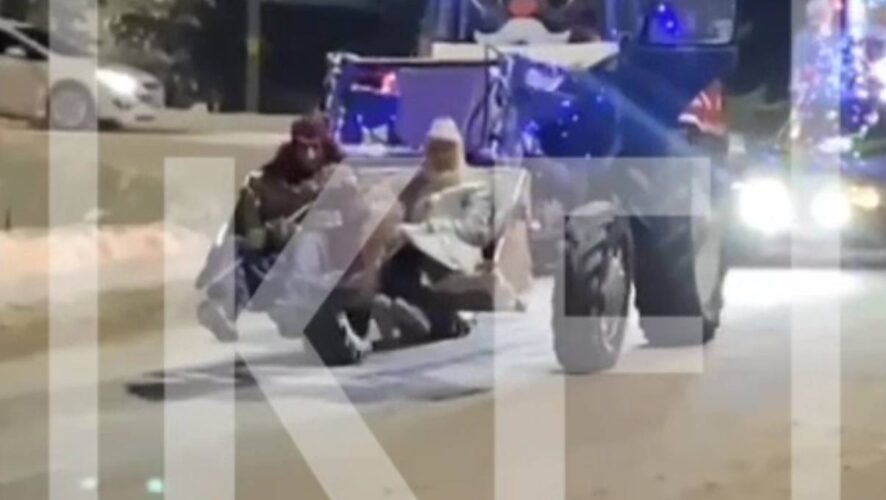 На кадрах видно, что на одной из трасс в республике целая колонна автомобилей встречала Новый год: некоторые машины нарядились в гирлянды и мишуру, а внутри автомобилей расположились люди в костюмах Деда Мороза.