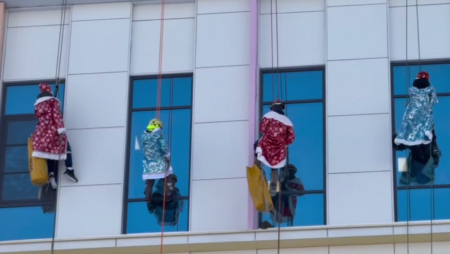 Студенты-спасатели устроили необычное новогоднее поздравление для маленьких пациентов Детской республиканской клинической больницы. Два Деда Мороза и две Снегурочки в альпинистском снаряжении спустились по стенам здания к окнам палат.