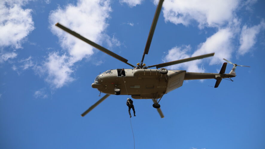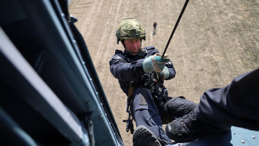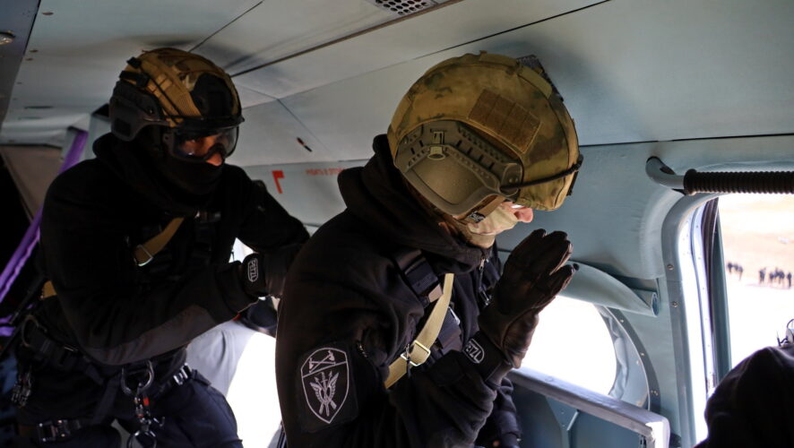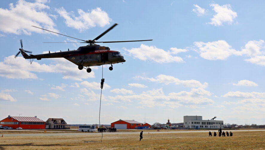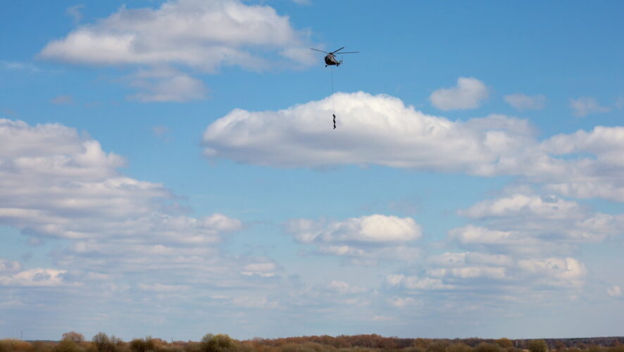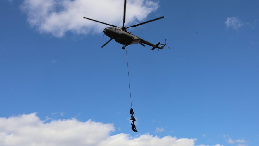 Во время тренировки были отработаны различные учебные элементы — десантирование по канату, спуск по веревке и беспосадочная эвакуация личного состава.