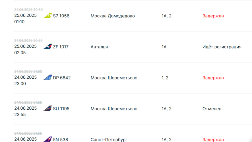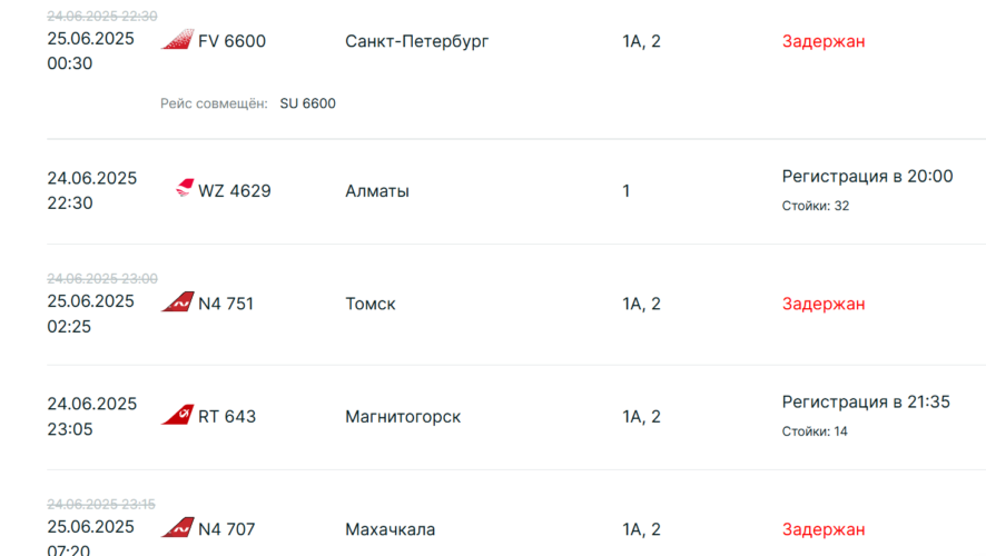 Среди задержанных рейсов — вылеты в Москву (Шереметьево), Санкт-Петербург, Томск и Махачкалу.