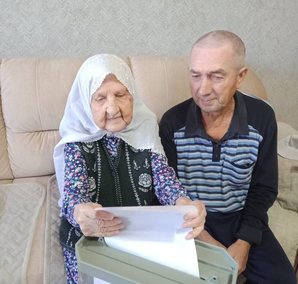 101-летняя Хадича Хамитова воспользовалась возможностью проголосовать на дому. Она встретила членов избирательной комиссии с улыбкой и внимательно изучила бюллетень.