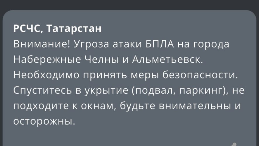 Угроза атаки беспилотными летающими средствами объявлена сразу в двух городах Татарстана — в Набережных Челнах и Альметьевске. Сообщение об этом поступило около пяти утра от МЧС России.