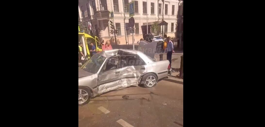 На кадрах видно смятую легковушку, которой «прилетело» в бок. От удара её развернуло поперёк проезжей части. На месте происшествия видно машину скорой помощи.