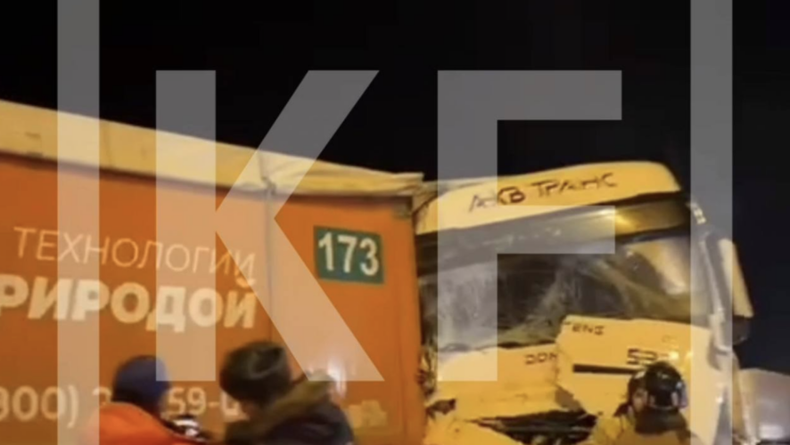 На кадрах видно, что грузовик врезался в заднюю часть второго большегруза, из-за чего у первого полностью смяло переднюю часть со стороны пассажирского сиденья. У второго большегруза помята задняя часть авто.