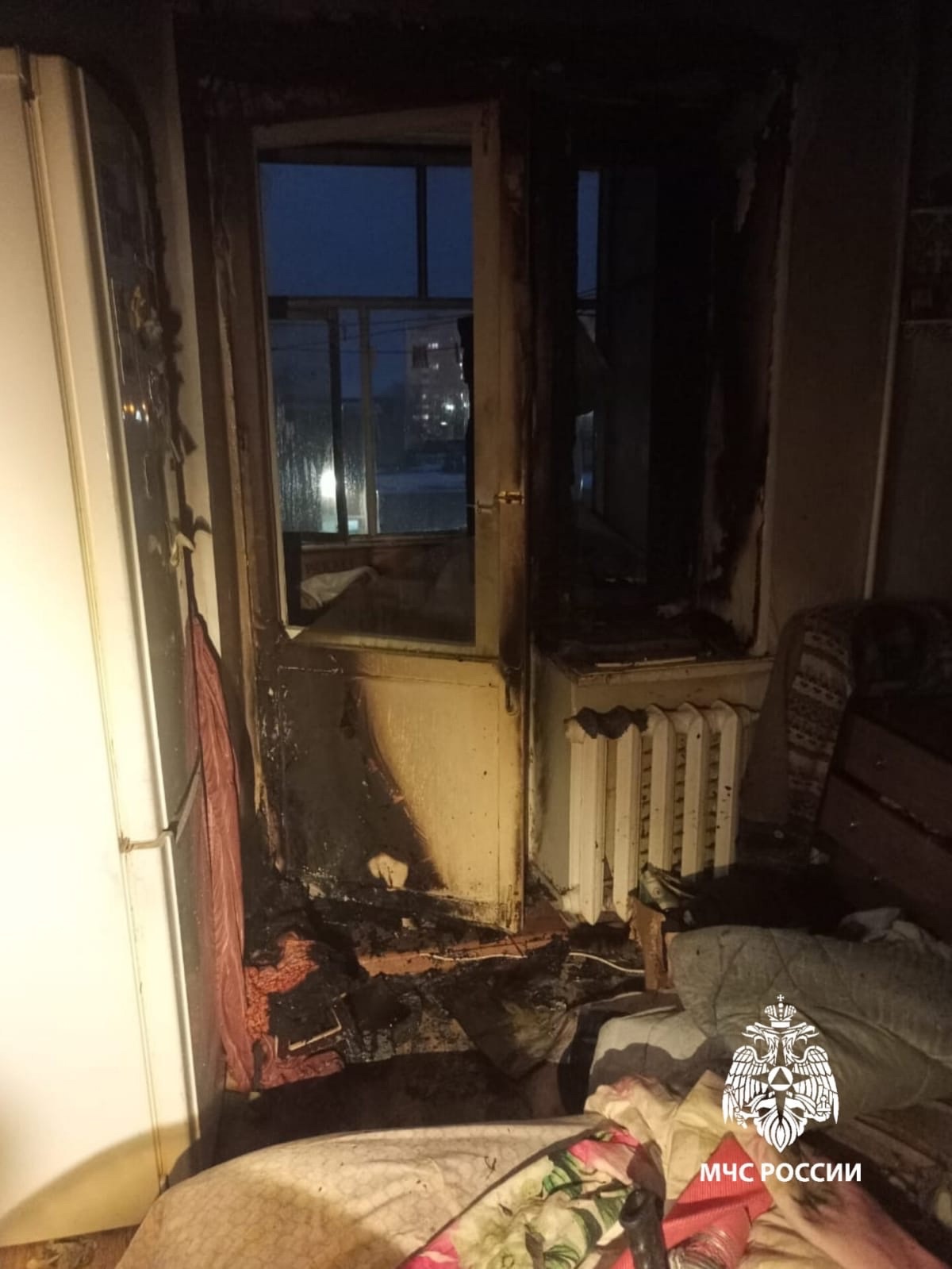 Прибывшие пожарные из горящей квартиры на 4 этаже спасли и вывели по лестничному маршу мужчину и женщину. Их передали врачам для осмотра. Горела оконная рама балкона на площади 1 квадратный метр.