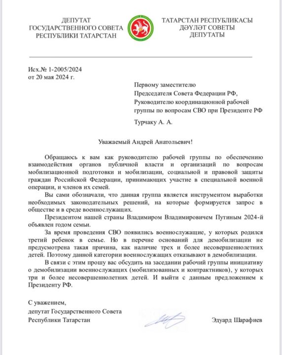 С этим предложением Шарафиев обратился к сенатору, секретарю Генерального совета партии «Единая Россия», руководителю координационной рабочей группы по вопросам СВО при Президенте РФ Андрею Турчаку.