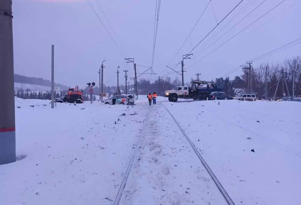 На запись видеорегистратора попало, как в Казани в районе поселка Аракчино на железнодорожном переезде электричка снесла автомобиль каршеринга.