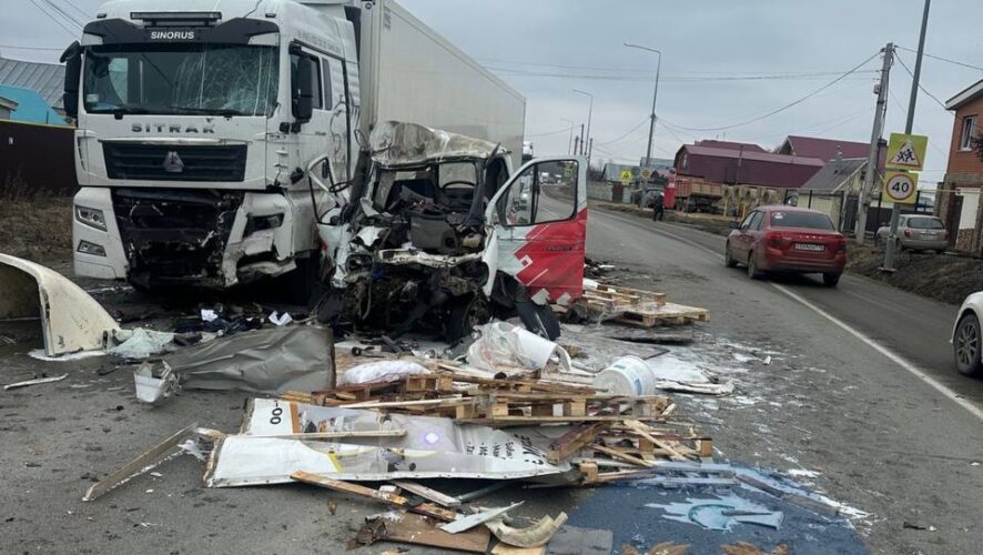 Авария произошла в Высокогорском районе РТ в понедельник 7 апреля. 53-летний водитель «ГАЗели», по предварительным данным, выехал на встречную полосу и совершил касательное столкновение с грузовым автомобилем DAF, после чего совершил столкновение с грузовым автомобилем Sitrak.