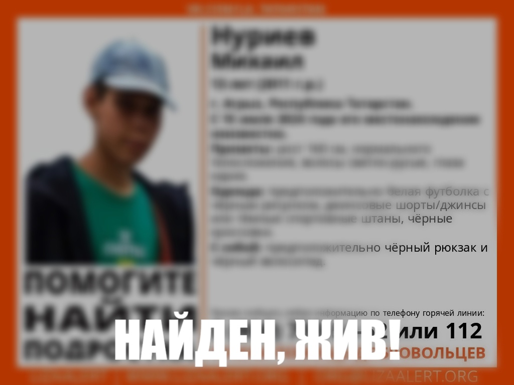 В Татарстане в городе Агрыз пропал 13-летний Нуриев Михаил. Об этом сообщает поисковой отряд «ЛизаАрлет».