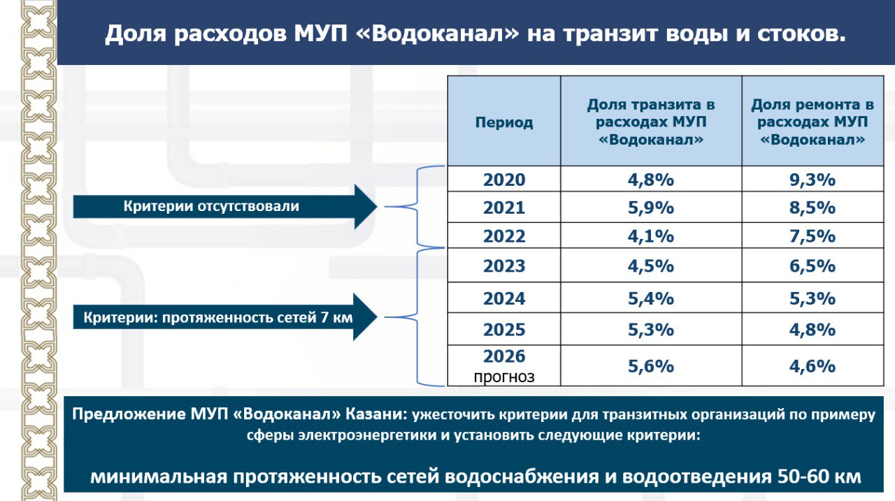 По данным Абдулхакова, к 2026 году расходы на оплату услуг двух транзитных организаций за транспортировку воды в Лаишевский район могут достигнуть 43,87 рубля за кубометр, тогда как тариф казанского «Водоканала» составляет 28,80 рубля. Это означает, что каждый кубометр воды, доставляемый в Лаишево через транзитные компании, будет приносить убытки в размере более 15 рублей.