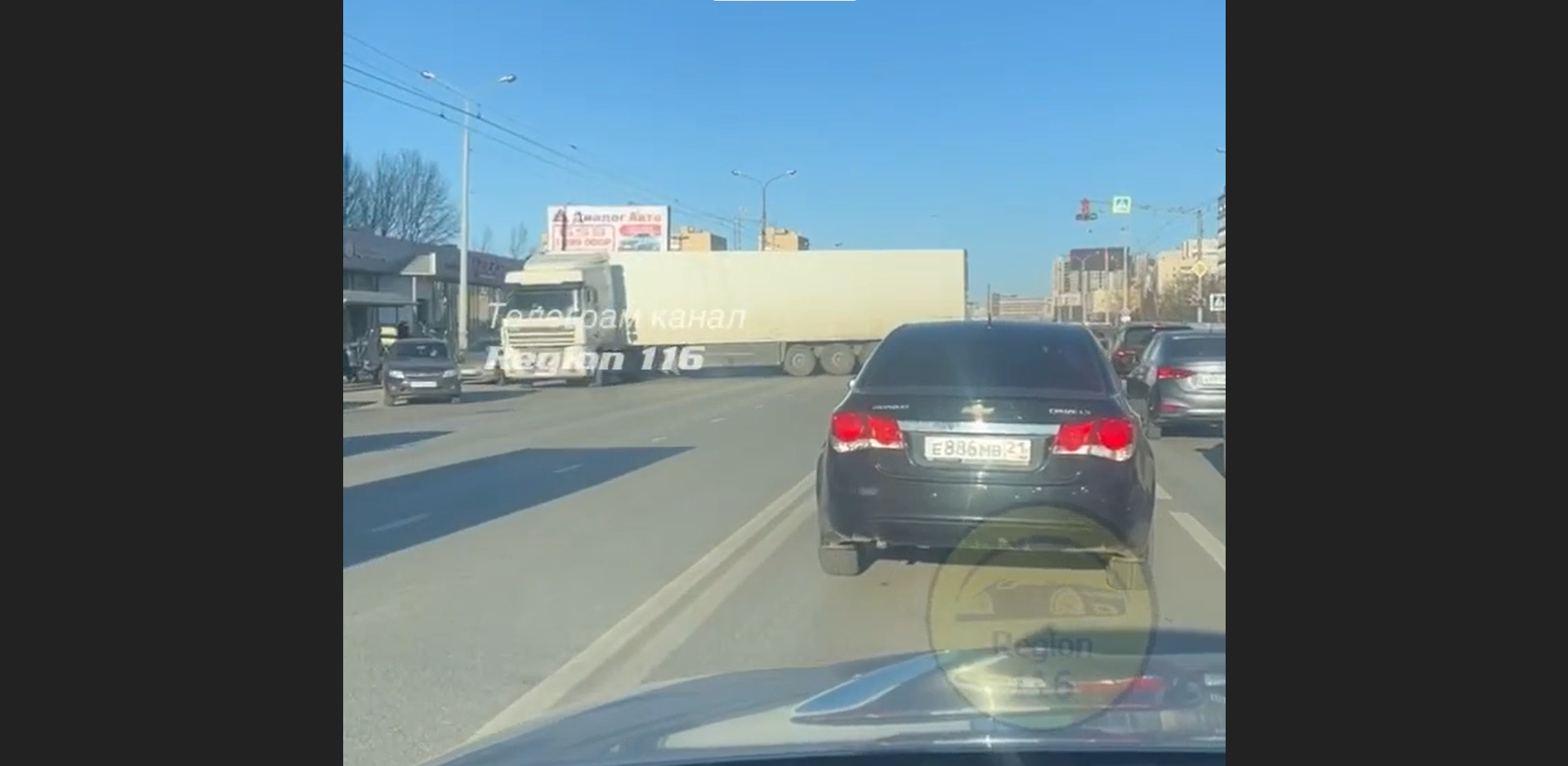 В Казани возле Энергоуниверситета фуру развернуло в ДТП и она перекрыла дорогу. Об этом сообщают очевидцы происшествия в социальных сетях.