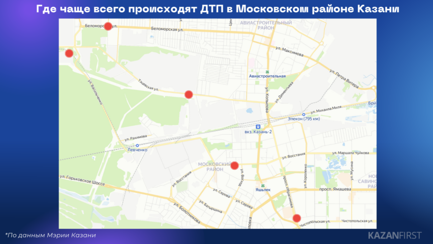 Замыкают рейтинг самых опасных точек Кировский и Московский район. Здесь аварии происходят на перекрестках: улица Беломорская — улица Химиков, улица Восход — улица Восстания, улица Кулахметова — улица Болотникова, проспект Ибрагимова — улица Черноморская, улица Вахитова — улица Большая Крыловка, улица Тэцевская — улица Хлебозаводская, улица Фрунзе — улица Кулахметова.