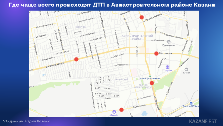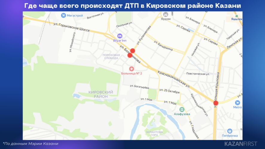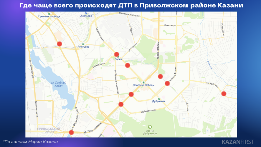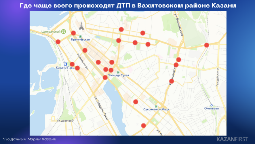 Лидерами по количеству «аварийных» мест стали Вахитовский и Приволжский районы — самые оживленные части Казани. Больше всего ДТП происходит на перекрестках. Среди них: улица Пушкина –  улица Большая Красная, улица Горького — улица Гоголя, улица Большая Красная — улица Муштари, улица — Островского — улица Астрономическая и улица Университетская, улица Бурхана Шахиди – улица Тази Гиззата, улица Бурхана Шахиди – улица Чернышевского, Фермское шоссе – магистраль 100-летия ТАСС, проспект Победы – улица Юлиуса Фучика и ряд других перекрестков.